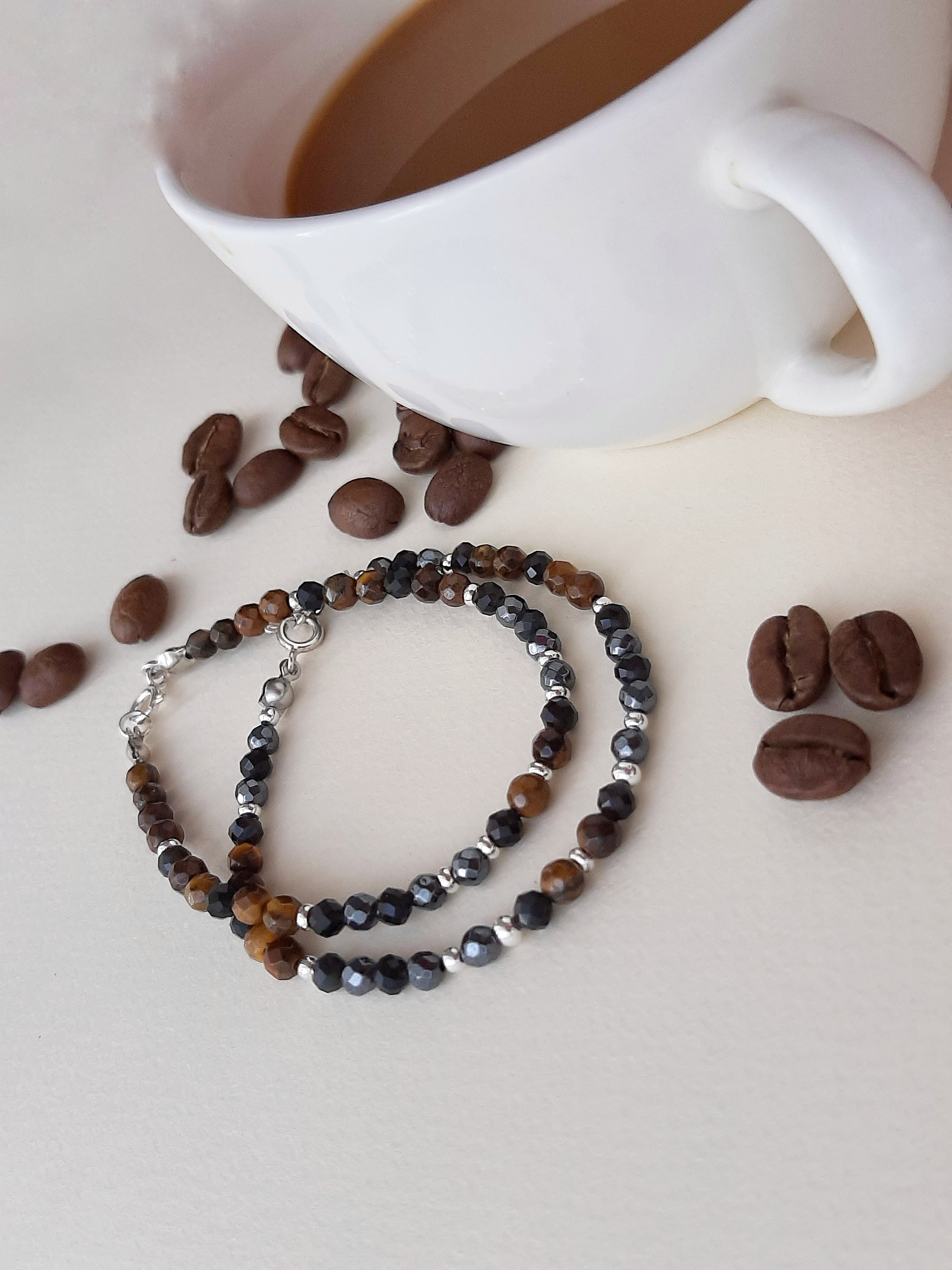 Натуральные камни могут сочетаться с серебром в наших изделиях. Это сплав отлично подчёркнет брутальность. Браслеты удобные в использовании, потому что на резинке.