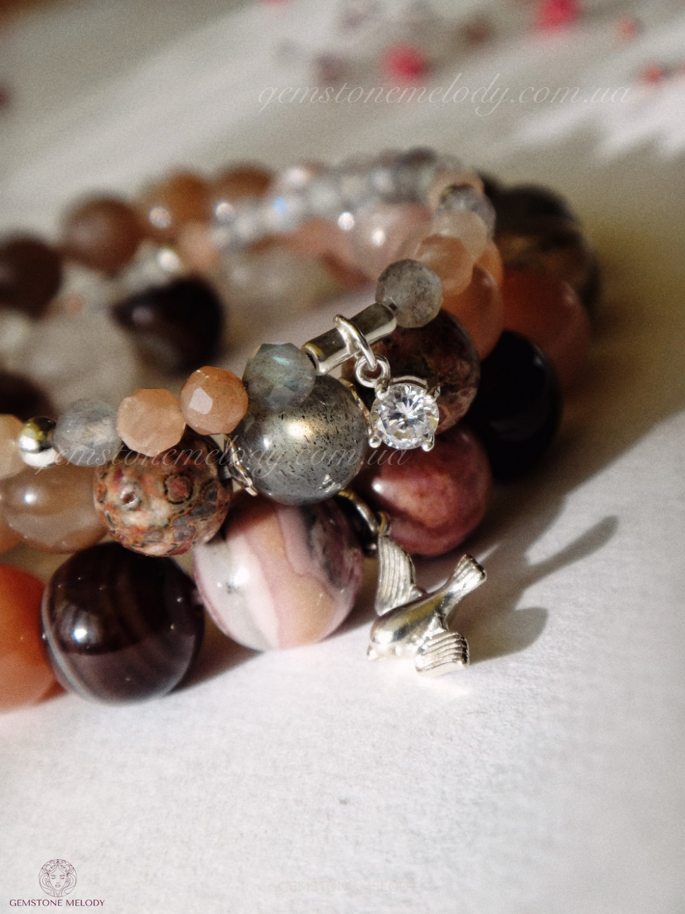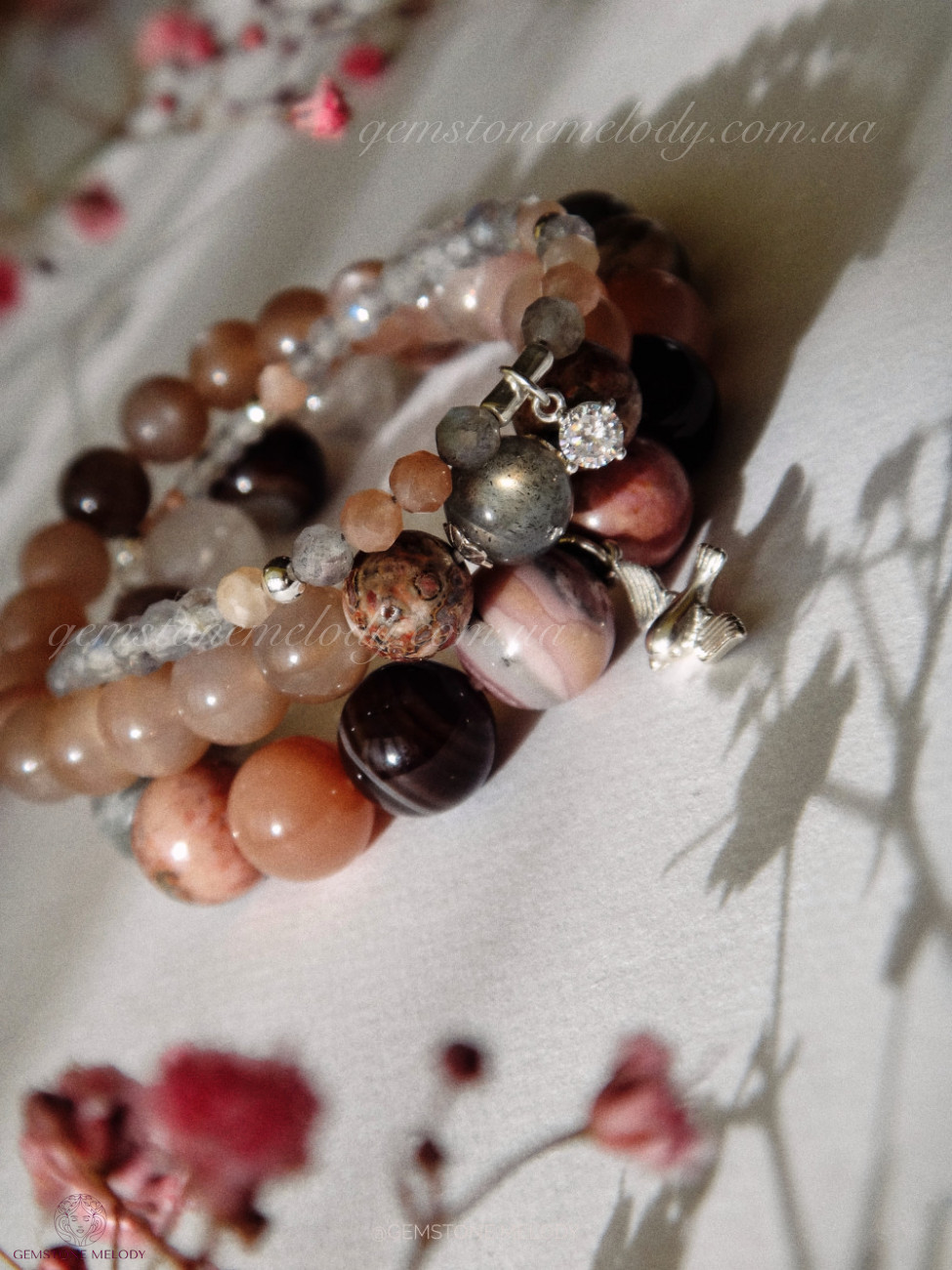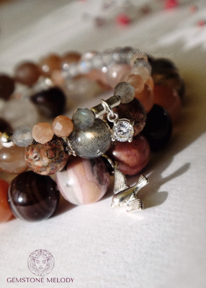 В браслетах поєднені жіночі камені такі, як родохрозит та родоніт 10мм, загадковий лабрадор, та камень, котрий насичен позитивною енергією, та ейтрайльним каменем-кварцем, який здатен очищати простір.