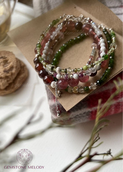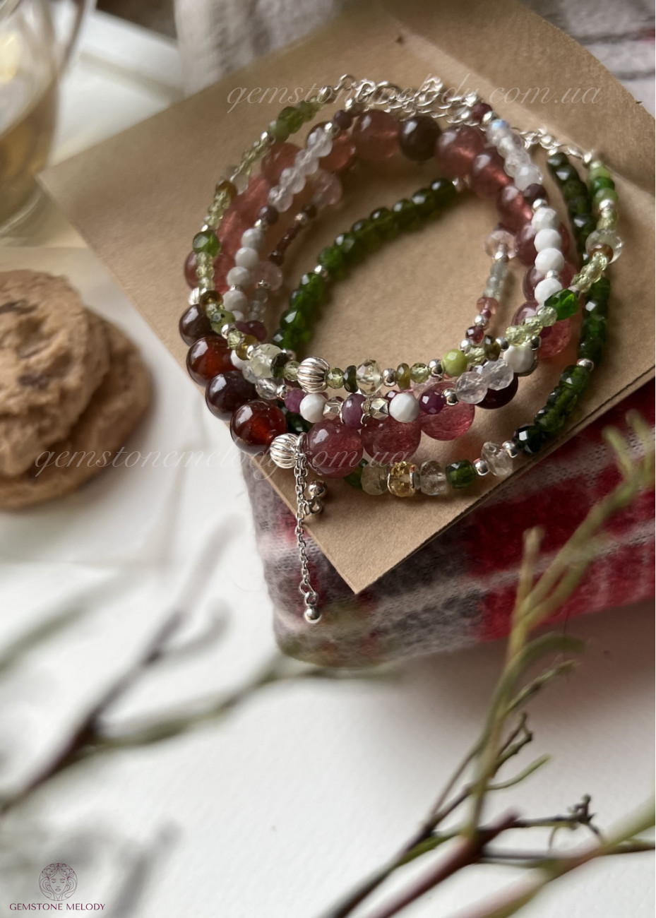 полуничний кварц 8мм, гранат з зірковим ефектом 8мм, гранат прозорий високої якості 8мм; на резинці;