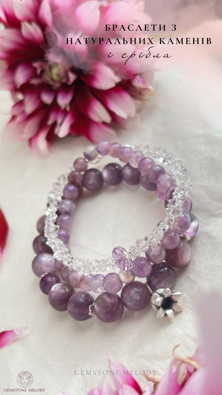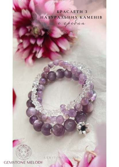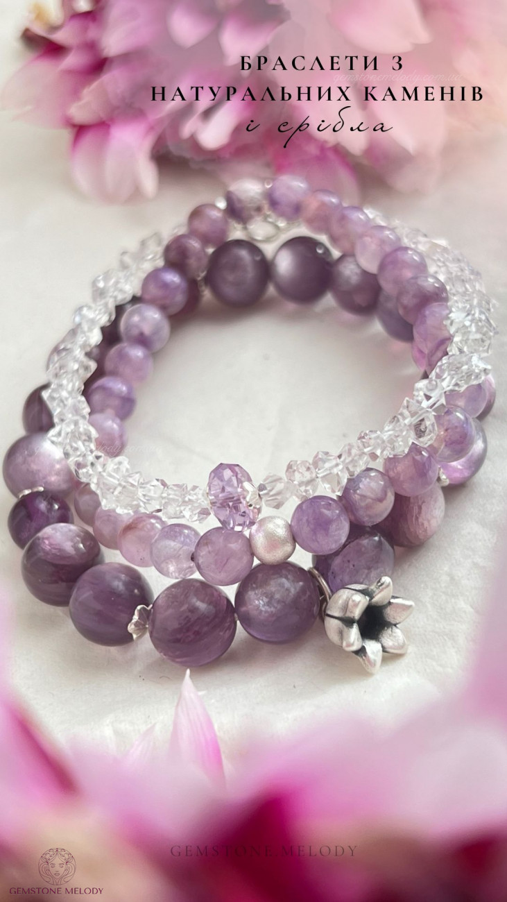 •нижній браслет: лепідоліт високої якості 9,5мм, вставки 2шт флюориту 7,5мм; підвіска дзвіночок- срібло 925 проби; на резинці; 1490 грн