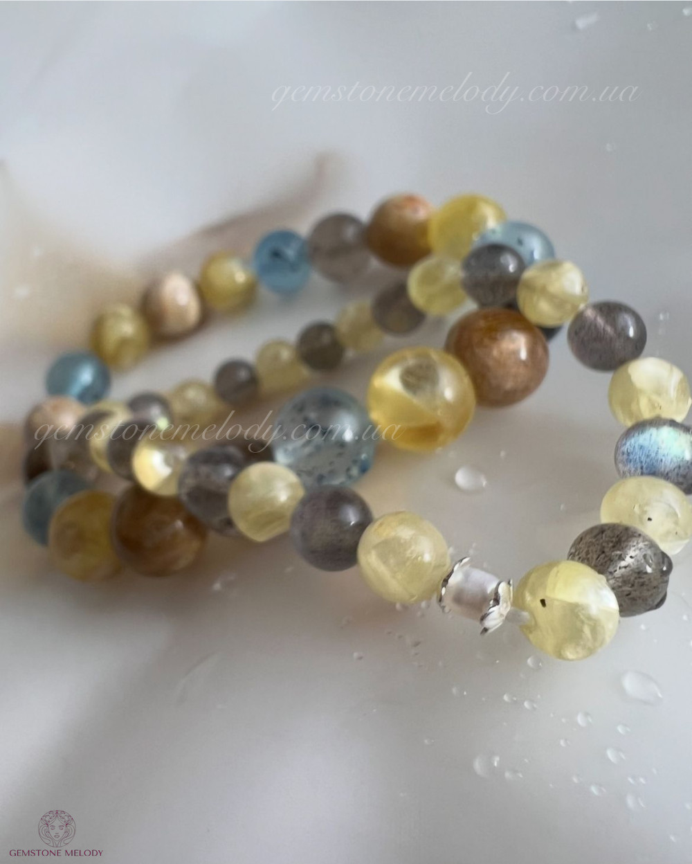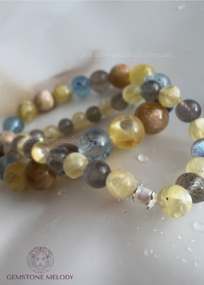 жовтий лепідоліт 6мм, лабрадор високої якості (ірізація в кожній намистині, прозорість) 6мм, вставка перлини, срібла; на резинці; 790 грн