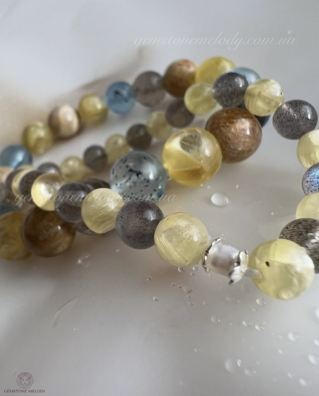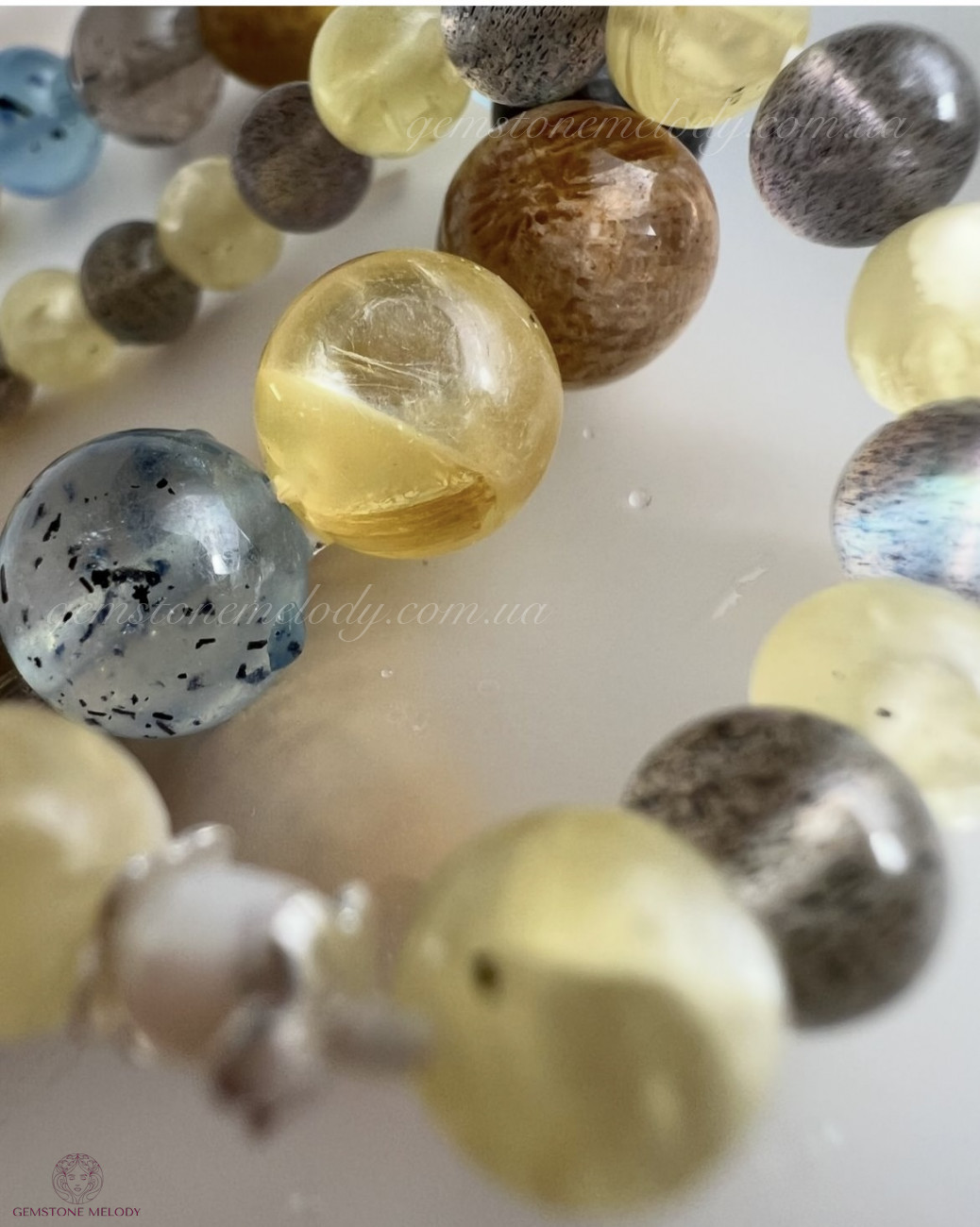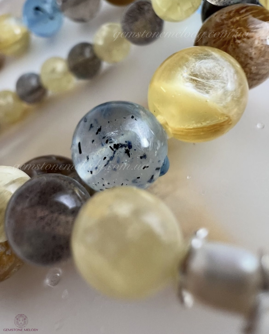 В браслетах: жовтий лепідоліт 10мм, аквамарин з шерлом 10мм, закамʼянілий корал 10мм, золотий азезтуліт 10мм, намистина чорного сонячного камінчика 9мм, на резинці; 1490 грн