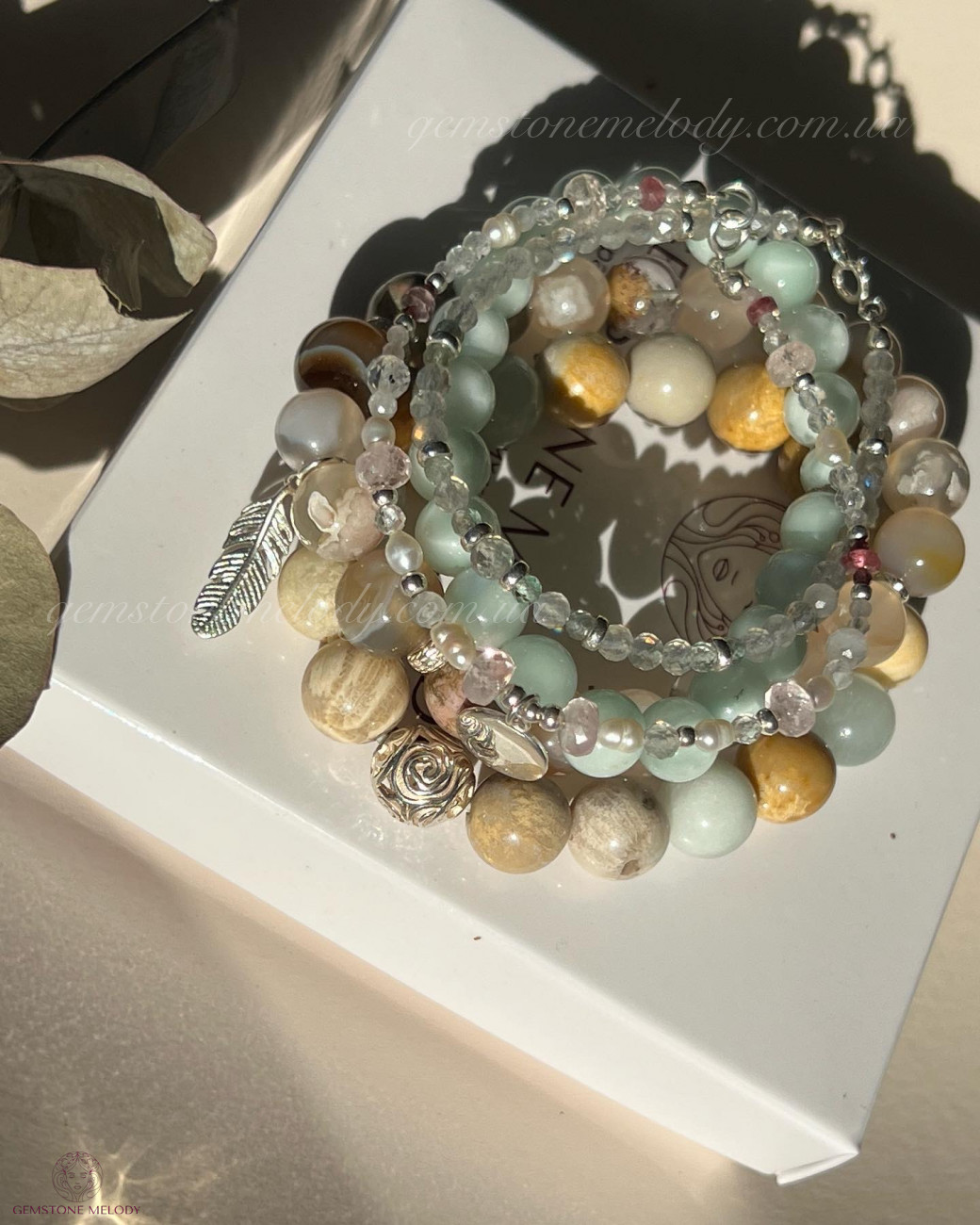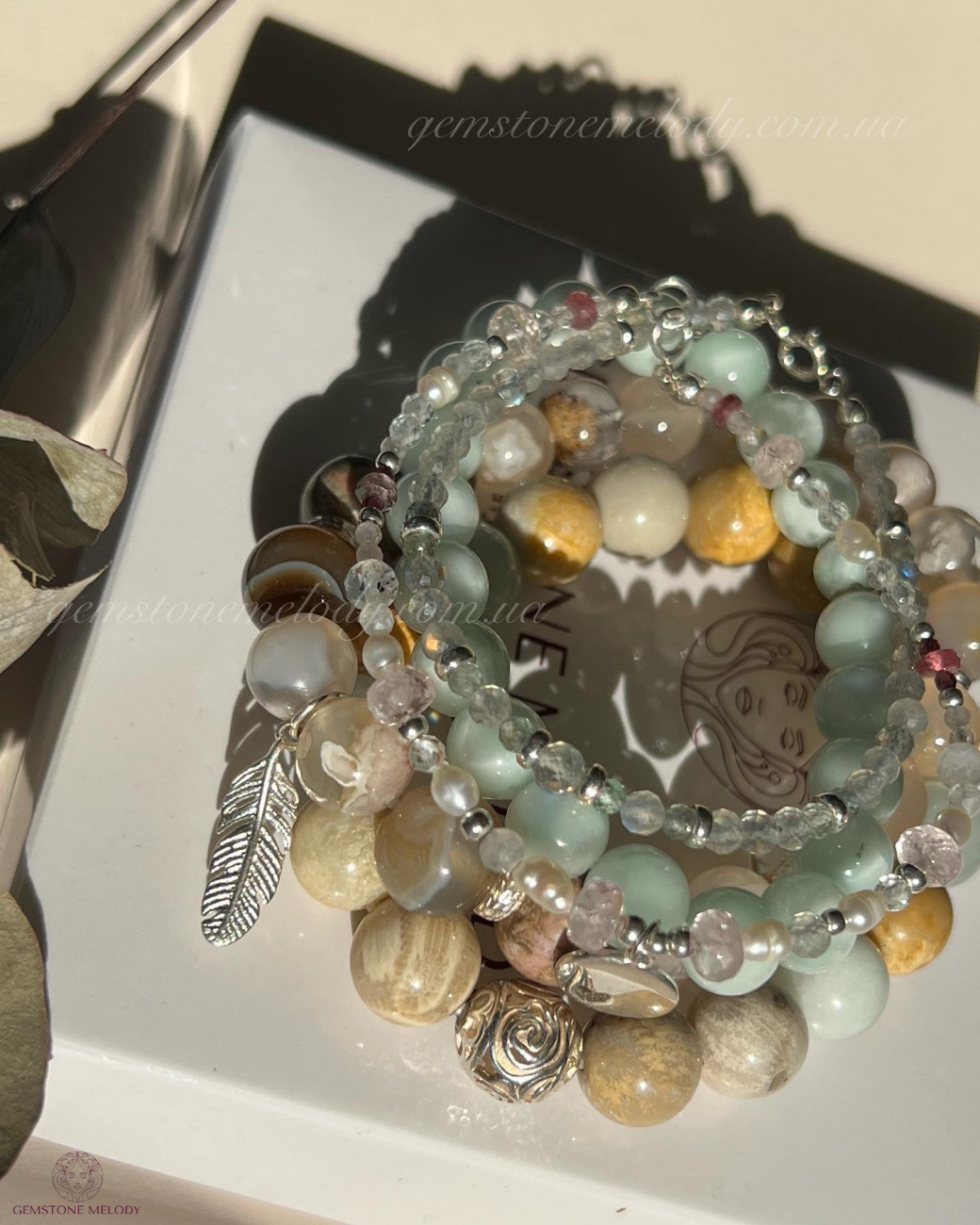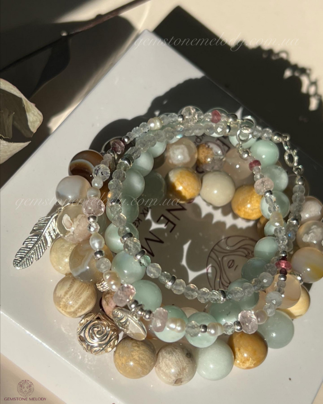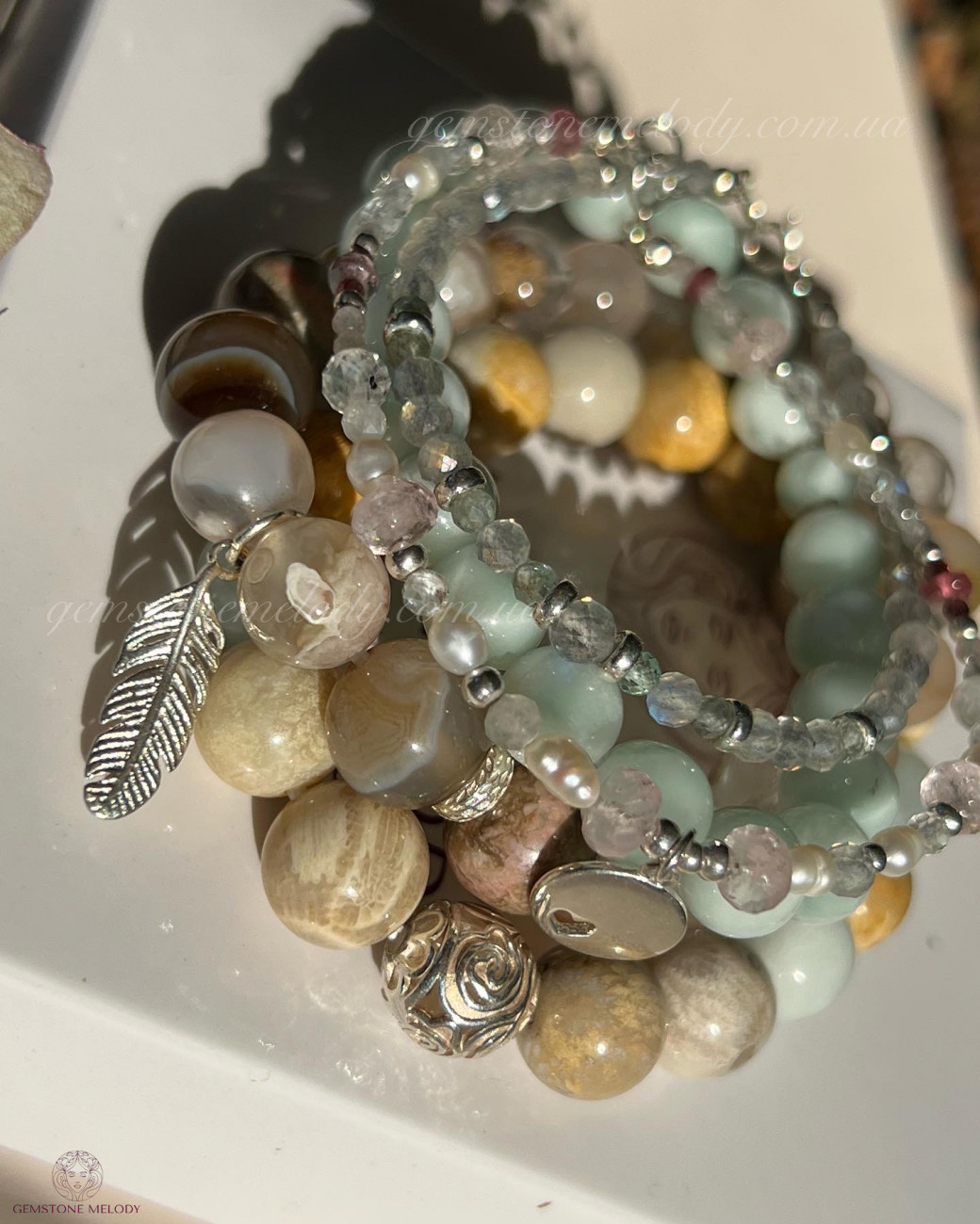 квітковий агат 8мм, родоніт 10мм, агат (Ботсвана) 10мм, фантомний кварц 8мм, срібло 925 проби;