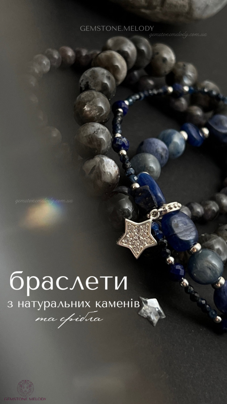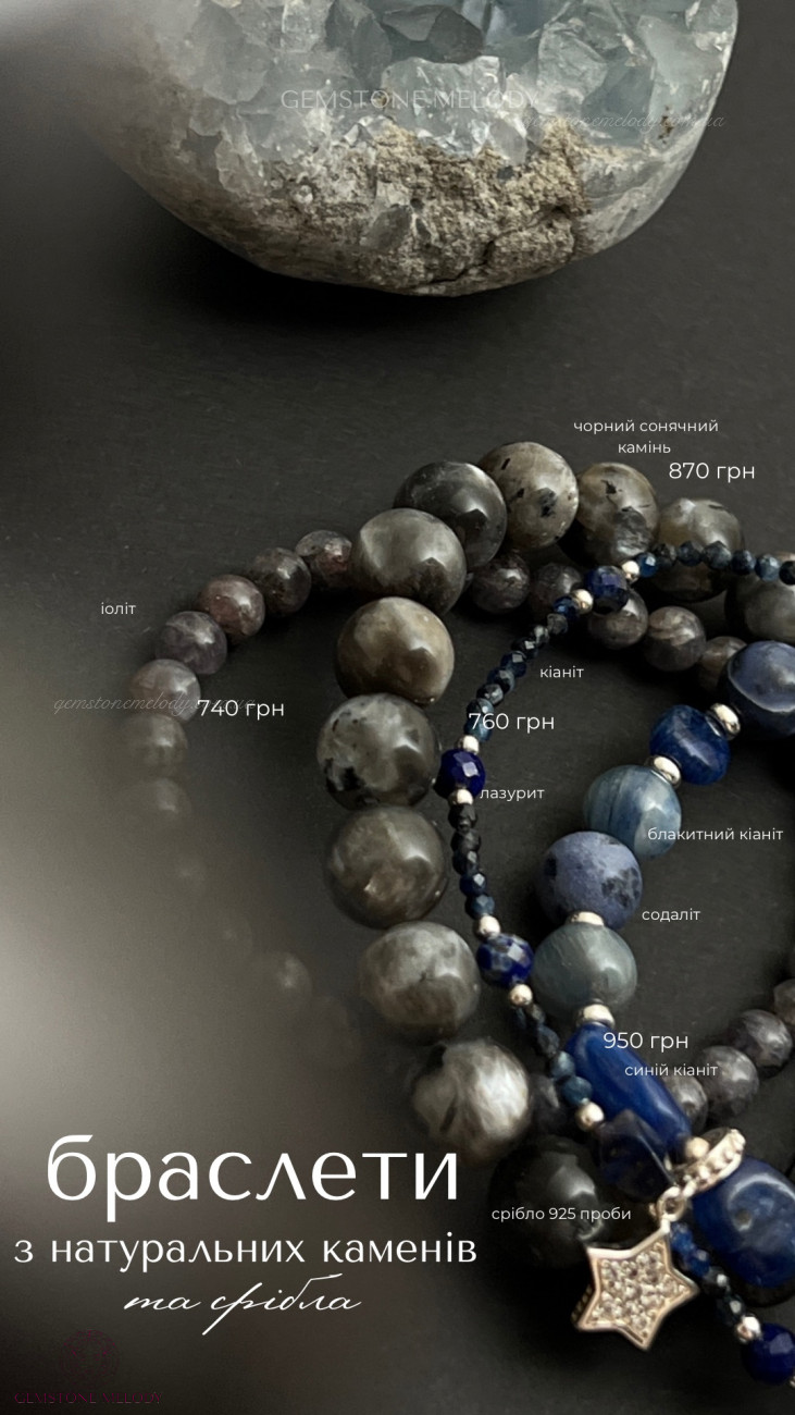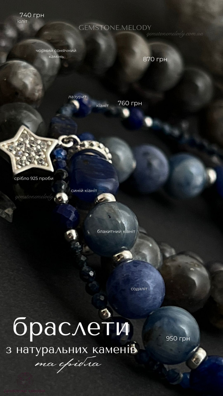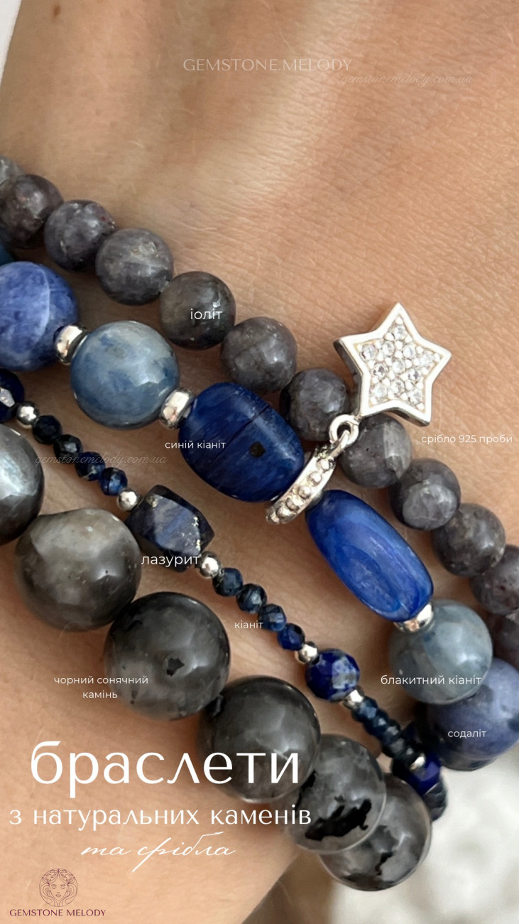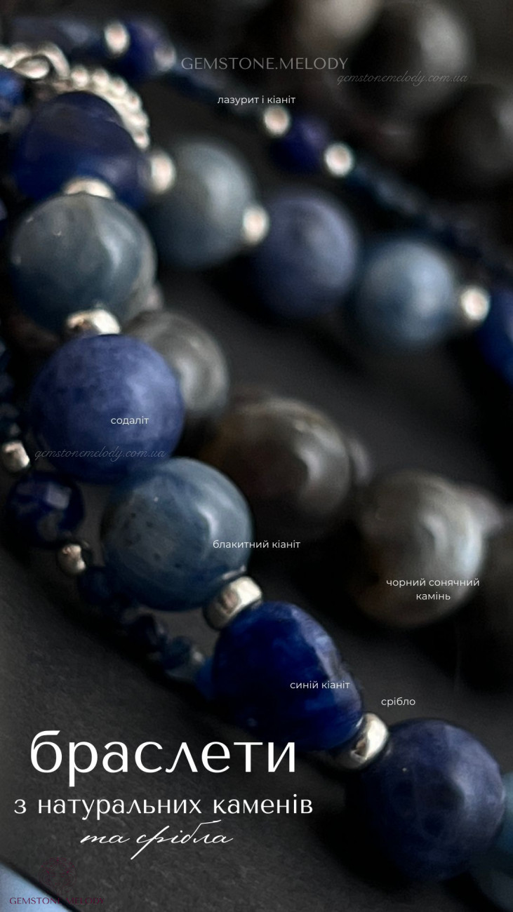 кіаніт блакитний 8мм, содаліт 8мм, кіаніт необленної форми; фурнітура 925 проби; на резинці;