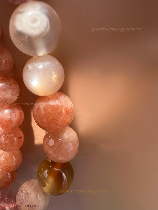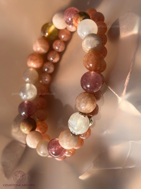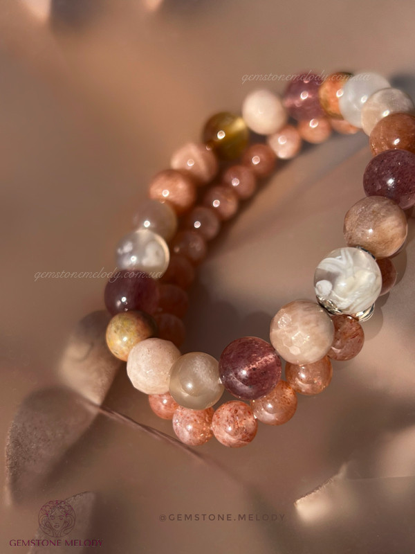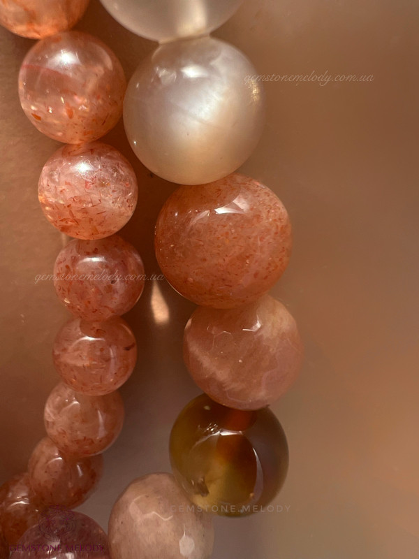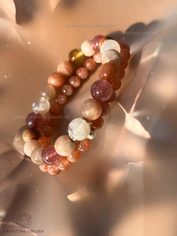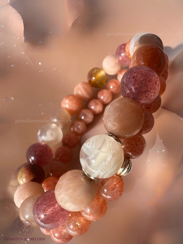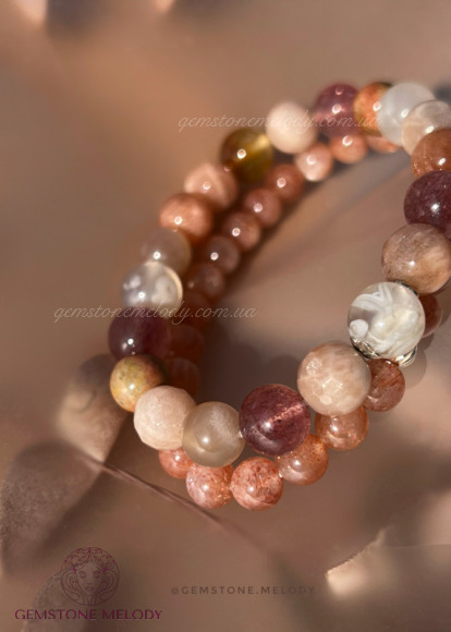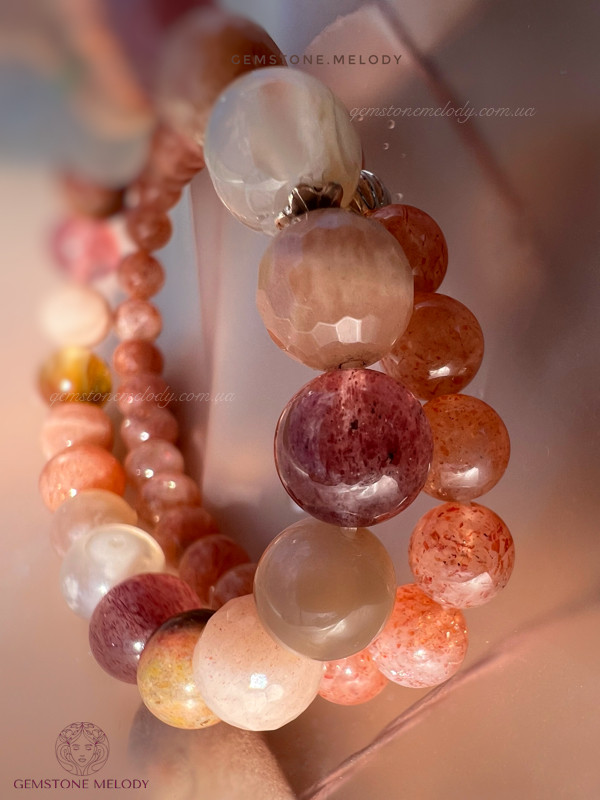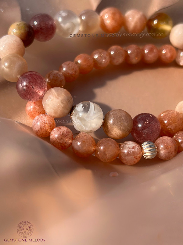 квітковий агат 9мм, полуничний кварц високої якості 8мм, яшма, сонячний кварц двох форм 8,5мм; фурнітура срібло 925 проби;