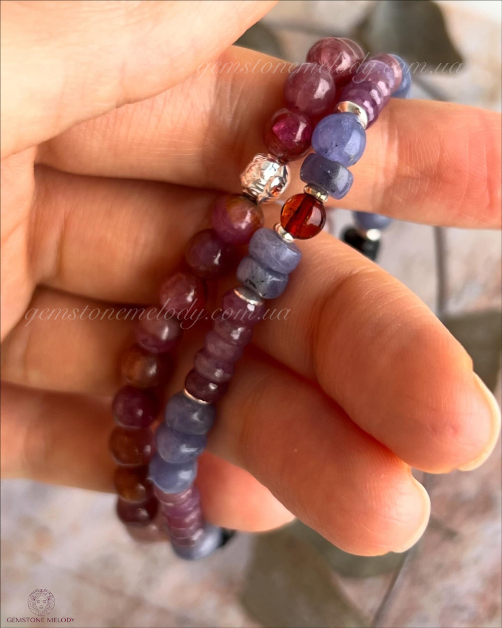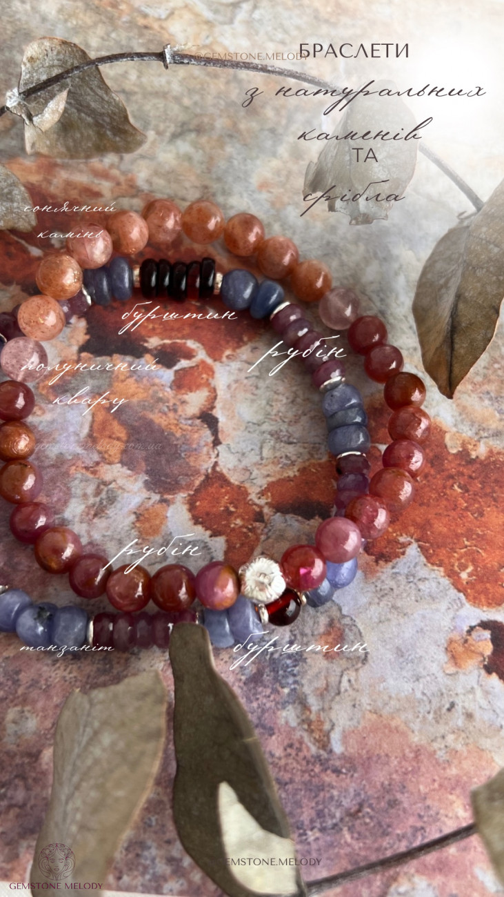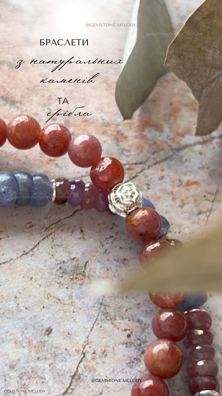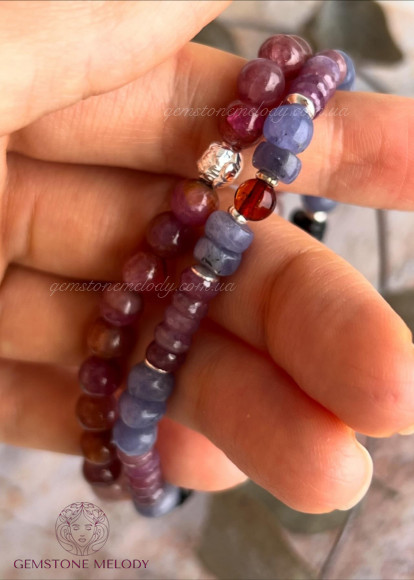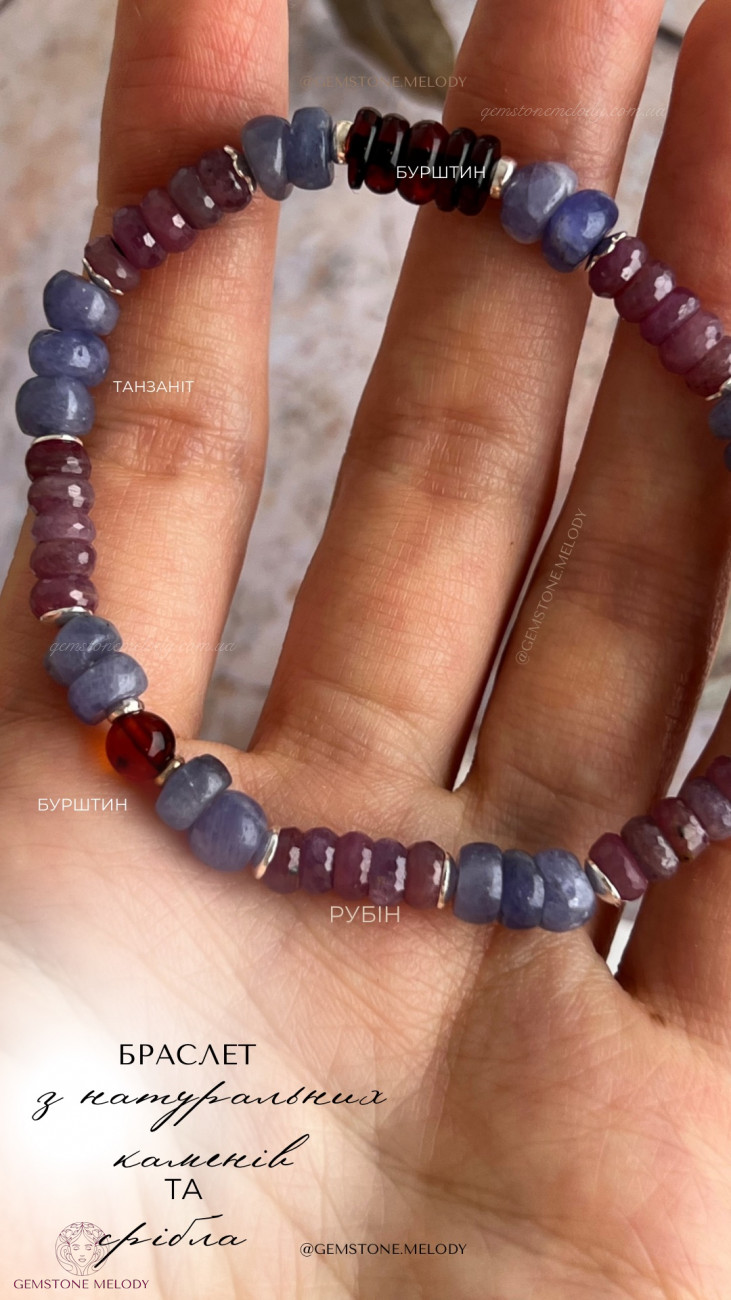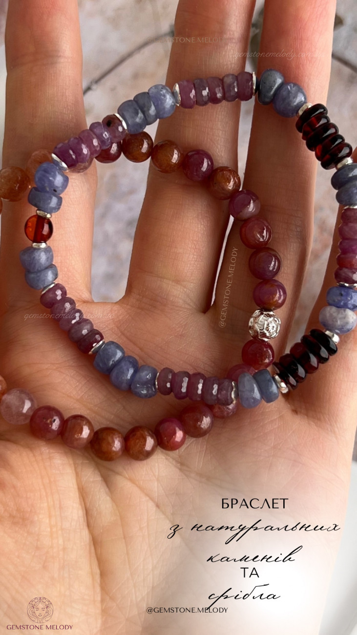 Набір з двох браслетів, танзаніт, рубіни, бурштин