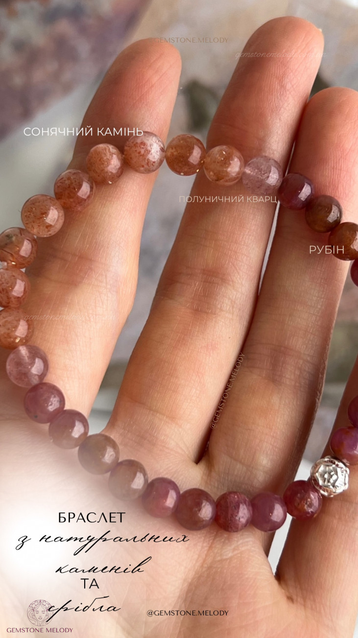 рубін 6мм,сонячний камінь 6мм, 2камінчика полуничного кварцу 6мм, срібло 925 проби;