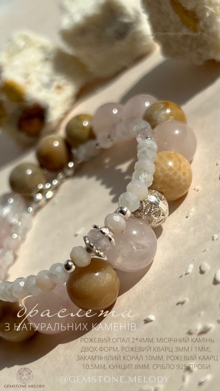 рожевий кварц 10мм, закам‘янілий корал 10мм, срібло 925 проби; на резинці;