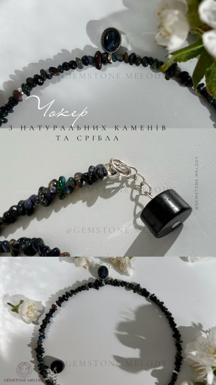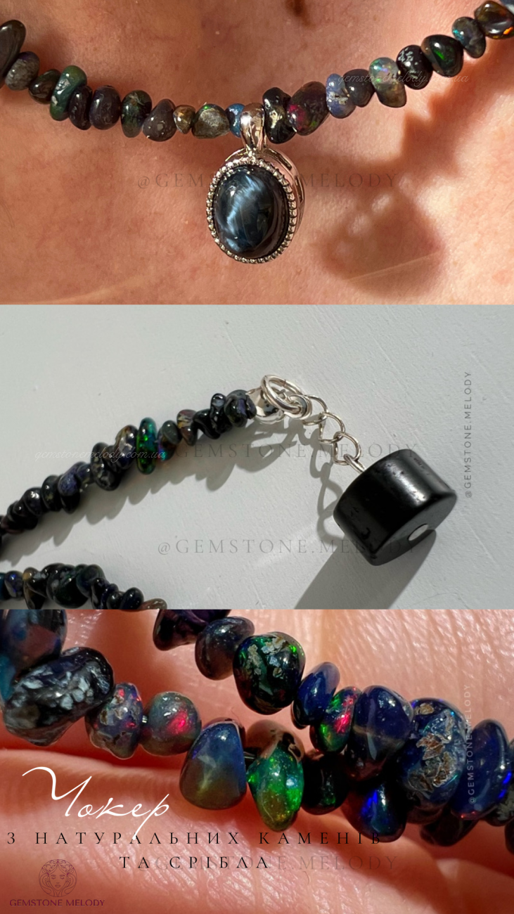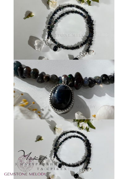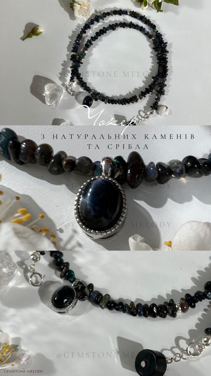 Кольє з натуральних каменів та срібла. Кольє з чорного опалу