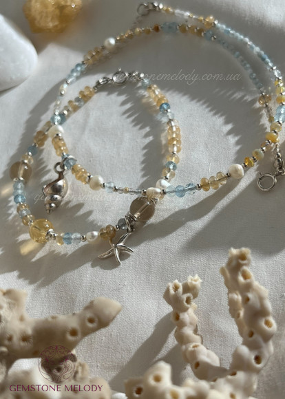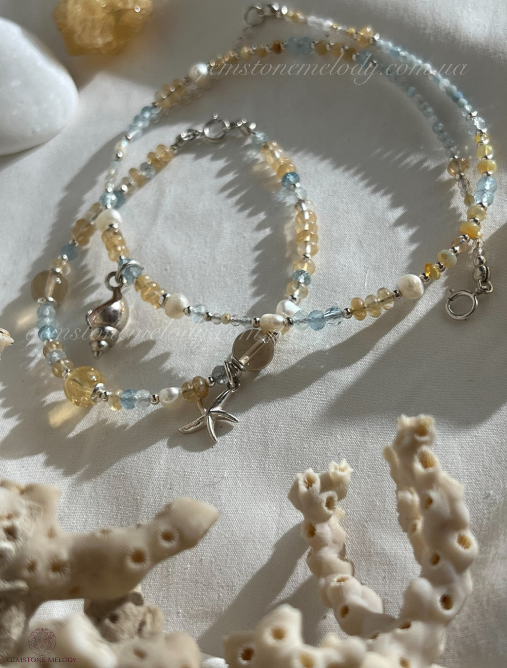 браслет: аквамарин 2*4мм, кварцит, перлини, опали, флюорит жовтий 7мм; срібло; на замочку;