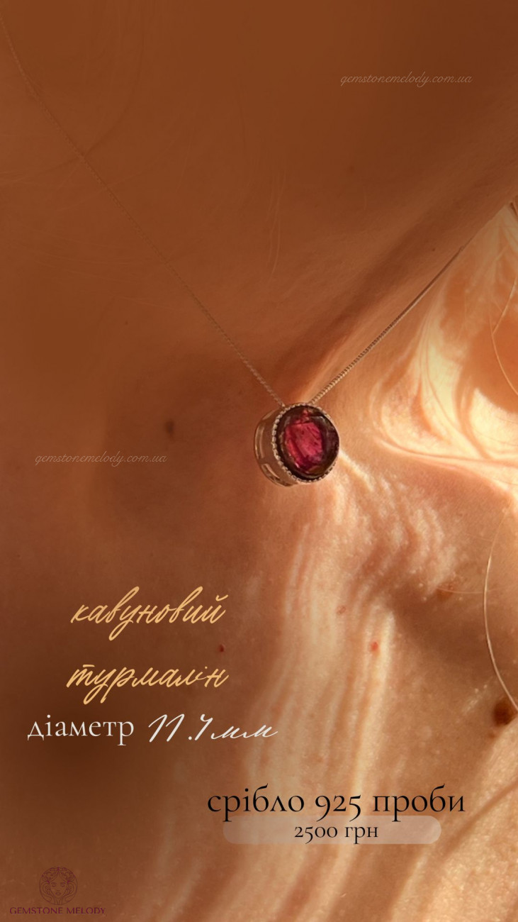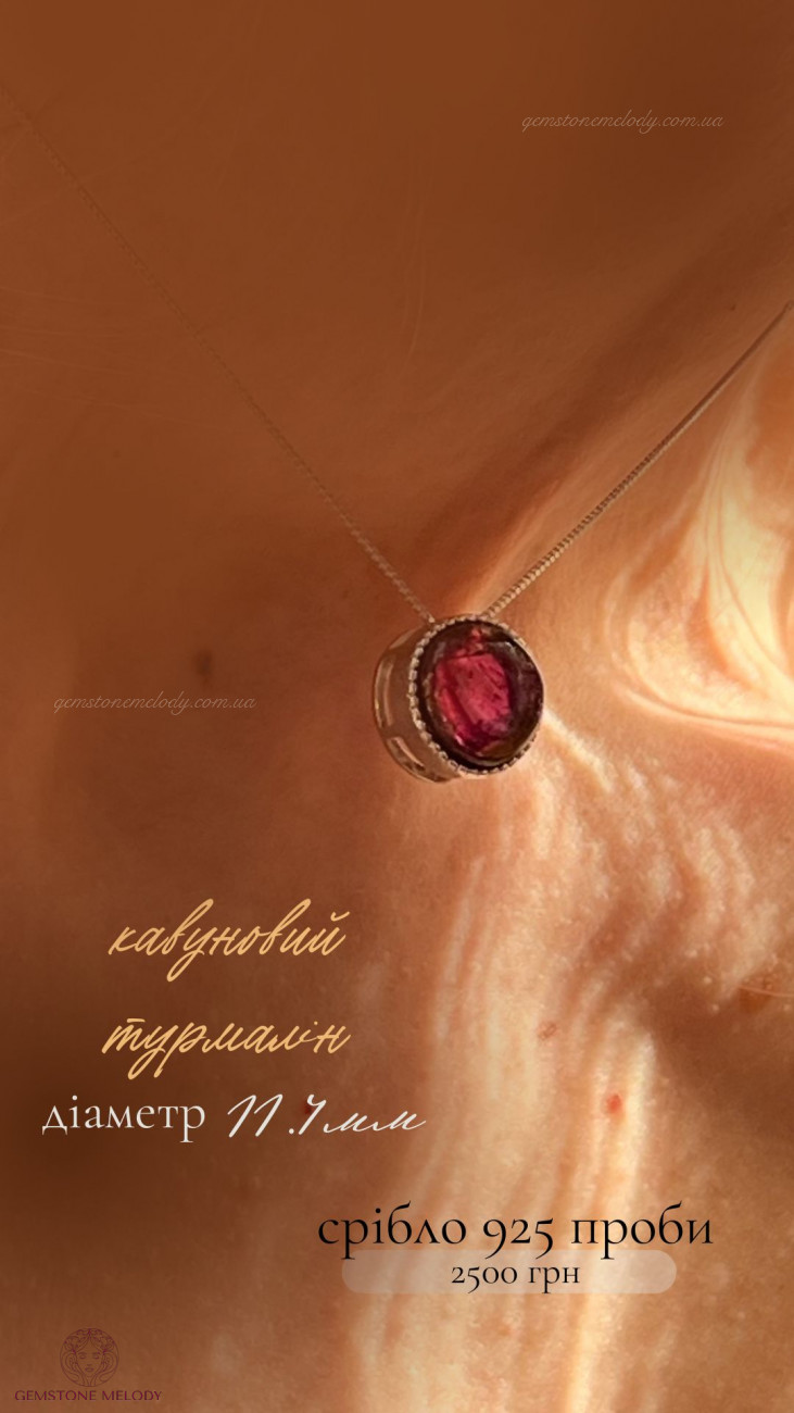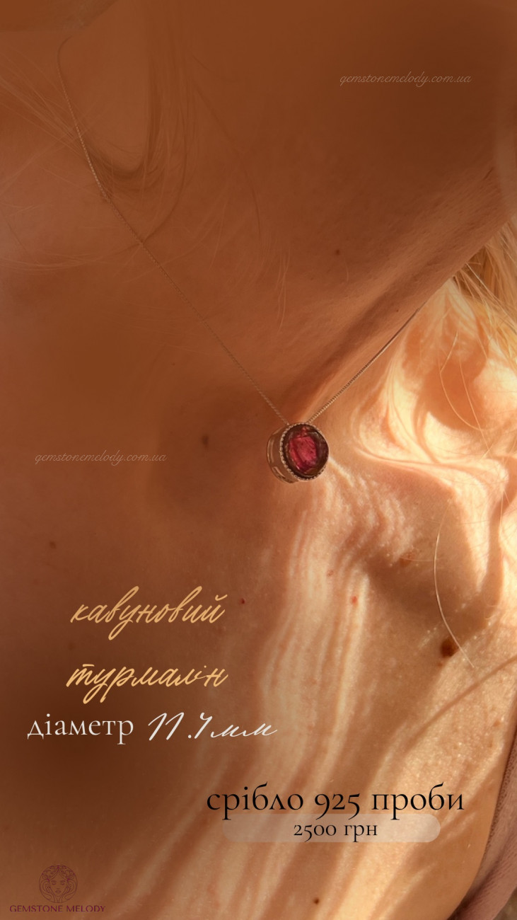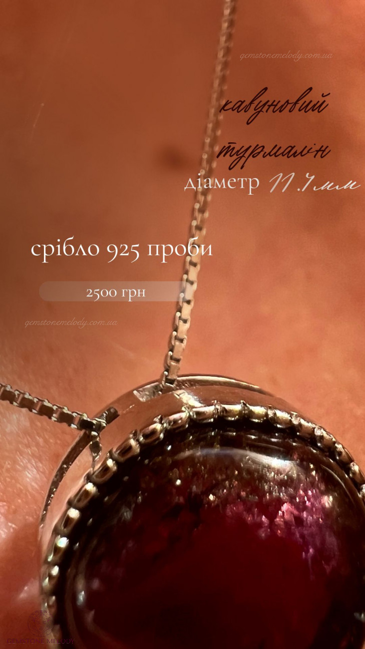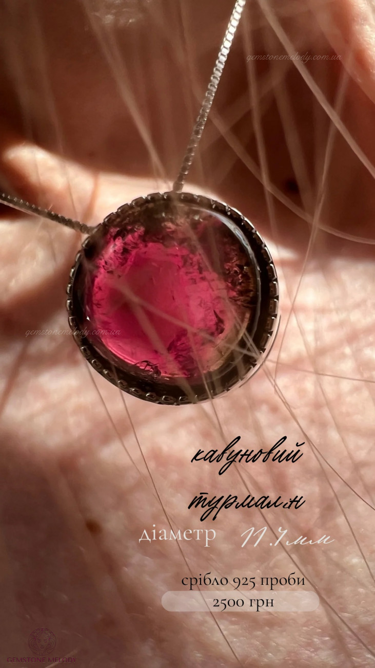 В кулоні : срібло 925 проби, кавуновий турмалін(рожево-зелений)-11.4мм; можно продягати ланцюжок в отвір посередині кулона; ціна без ланцюжка