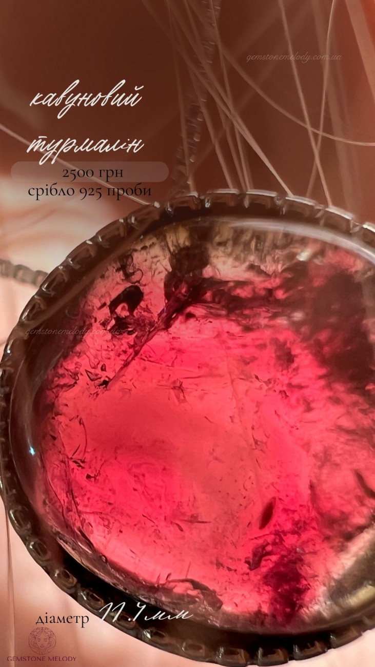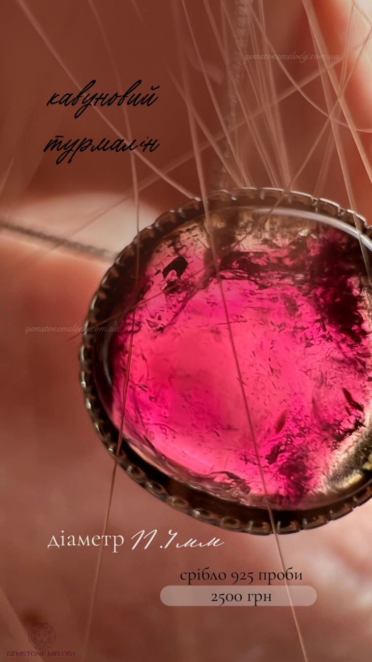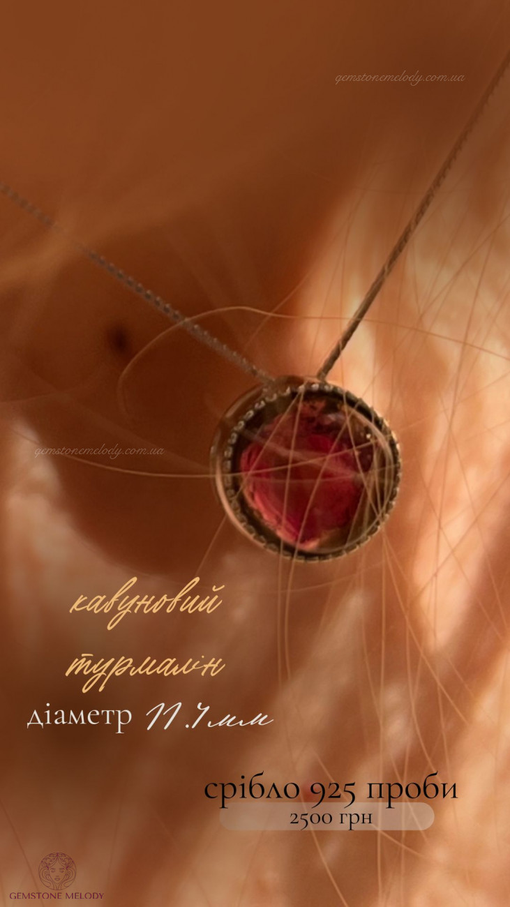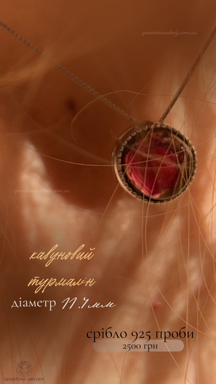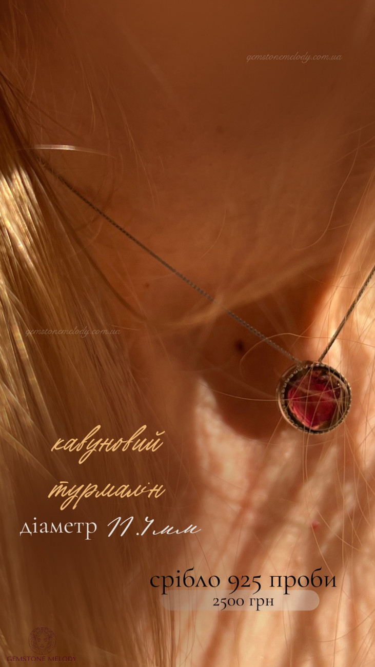 В кулоні : срібло 925 проби, кавуновий турмалін(рожево-зелений)-11.4мм; можно продягати ланцюжок в отвір посередині кулона; ціна без ланцюжка
